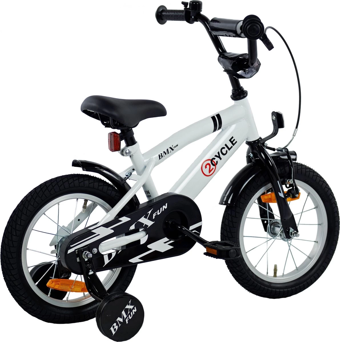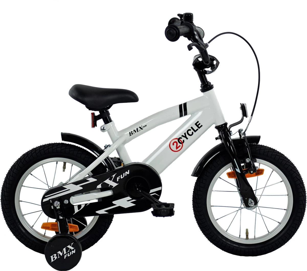 Stoere BMX jongensfiets met 14 inch wielen. De kinderfiets wordt geleverd met zijwielen die makkelijk verwijderbaar zijn als deze niet meer nodig zijn. Zowel het stuur als het zadel zijn in hoogte verstelbaar. De fiets wordt geleverd met een gesloten kettingkast, veilige handvatten (hoge rand) en bel.