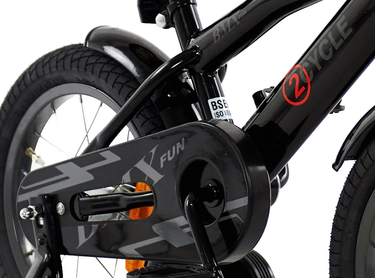 Stoere BMX jongensfiets met 14 inch wielen. De kinderfiets wordt geleverd met zijwielen die makkelijk verwijderbaar zijn als deze niet meer nodig zijn. Zowel het stuur als het zadel zijn in hoogte verstelbaar. De fiets wordt geleverd met een gesloten kettingkast, veilige handvatten (hoge rand) en bel.