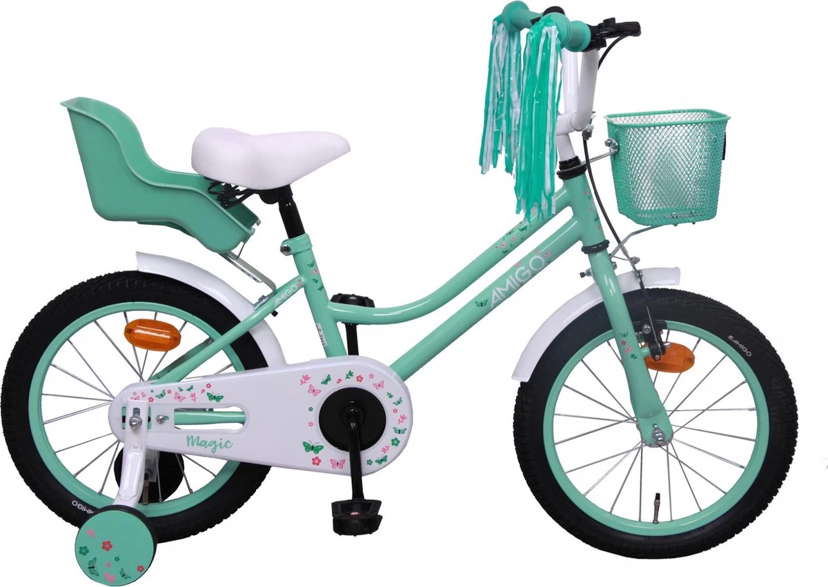 Laat je betoveren door de Amigo Magic. Een schattige meidenfiets die zo uit een sprookje komt gereden. Neem het speelgoed mee in het mandje en een pop in het meegeleverde poppenzitje. Tijdens iedere rit wapperen de stuurslingers sprookjesachtig door de wind en geven de zijwielen stabiliteit. Het lijkt wel magie!