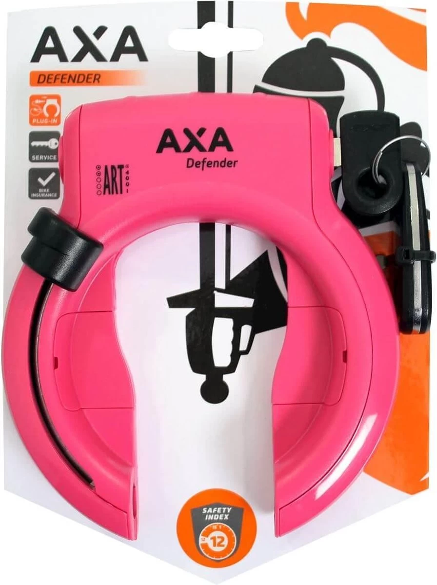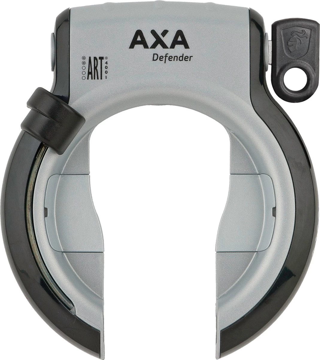 De AXA Defender is een sterk ringslot met een stalen kast in een kunststof behuizing. De slotbeugel is gemaakt van gehard staal en is 8,5 millimeter dik. Het ringslot is heeft een extra brede opening van 58 millimeter, waardoor hij ook geschikt is voor fietsen met brede banden. De AXA Defender is op verschillende manieren te monteren. Standaard wordt deze gemonteerd met de flexibele bevestigingsset (niet meegeleverd) die op elke vorm framebuis is toe te passen.