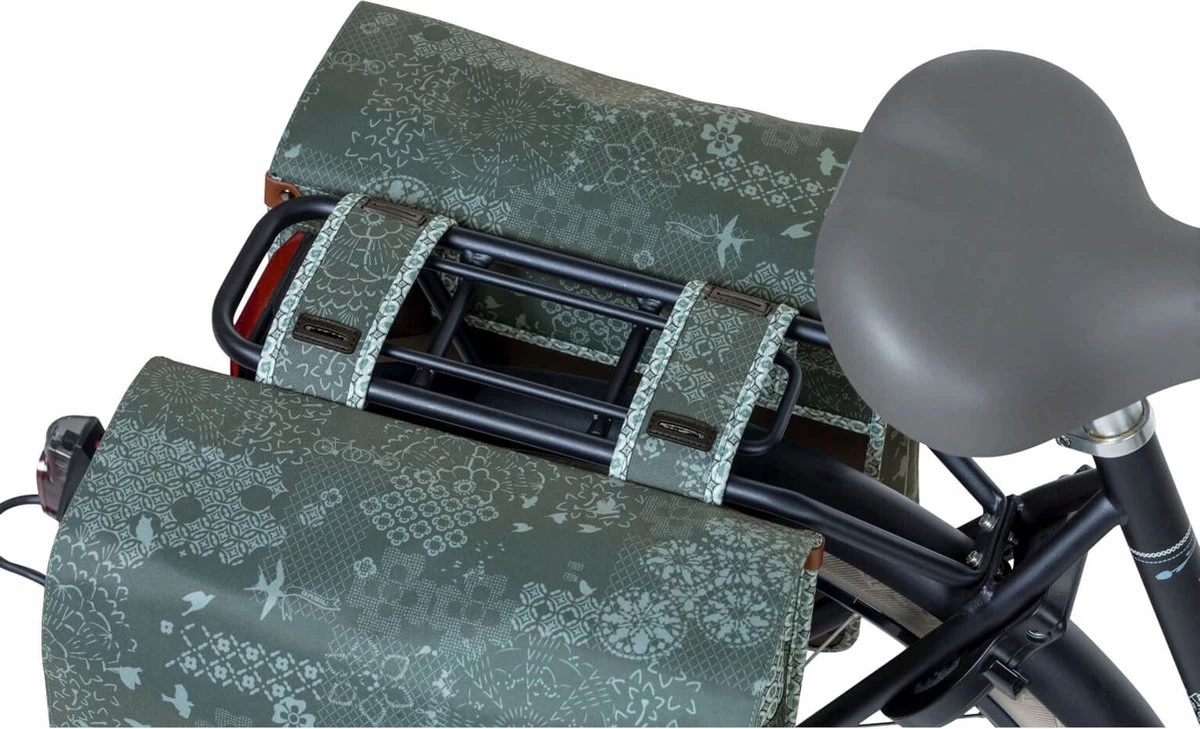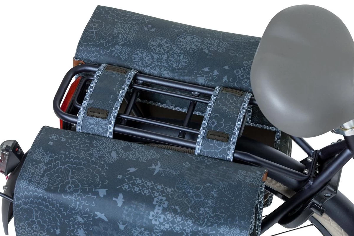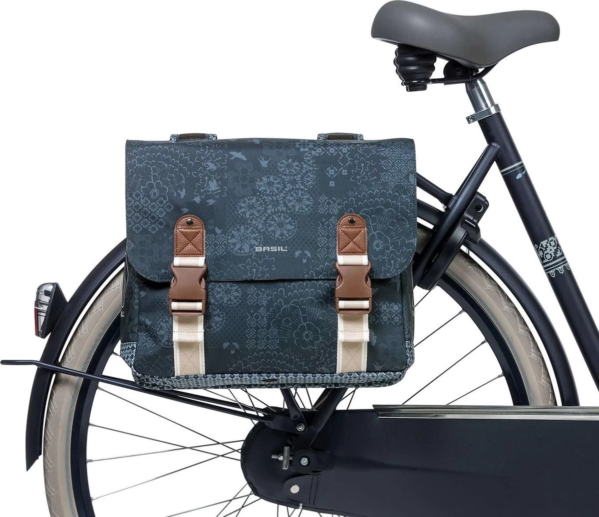 De Basil Bohème dubbele fietstas is een dubbele fietstas met een stijlvolle bohemien print. De blauwe tas heeft een inhoud van 35 liter waardoor je er meer dan genoeg boodschappen, sportspullen en andere benodigdheden in kwijt kan. Een fietsrit naar de supermarkt of een fietstrip met vriendinnen, deze fietstas maakt jouw fietsrit makkelijker en leuker. De fietstas is geschikt voor diverse bagagedragers (ook e-bikes) en beschikt over een stevige binnenvoering en kunstlederen details. Middels een aansnoerkoord en verstelbare kliksluitingen is de tas goed afsluitbaar. Door het waterafstotende polyester blijft de inhoud van de tas droog bij een kleine regenbui. De reflectiedetails op beide kanten zorgen ervoor dat je beter zichtbaar bent in het donker. Dankzij het Universal Bridge systeem bevestig je de tas eenvoudig op je bagagedrager. Ook op de bagagedrager van je elektrische fiets. Het Universal Bridge systeem bestaat uit vier gleuven. Deze gleuven maken het mogelijk om de tas op twee manieren te bevestigen: • Vaste montage: met behulp van de meegeleverde riempjes. • Afneembaar: in combinatie met een adapterplaat. Geschikt voor adapterplaten van MIK en Racktime platen. Deze adapterplaten dien je apart aan te schaffen. Eigenschappen: De fietstas is geschikt voor diverse bagagedragers (ook e-bikes). De tas kan door het waterafstotende polyster tegen een regenbuitje, maar zal na een dag in de regen niet meer kurkdroog zijn. De reflectiestukken maken je beter zichtbaar in het donker.