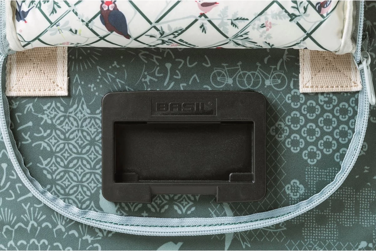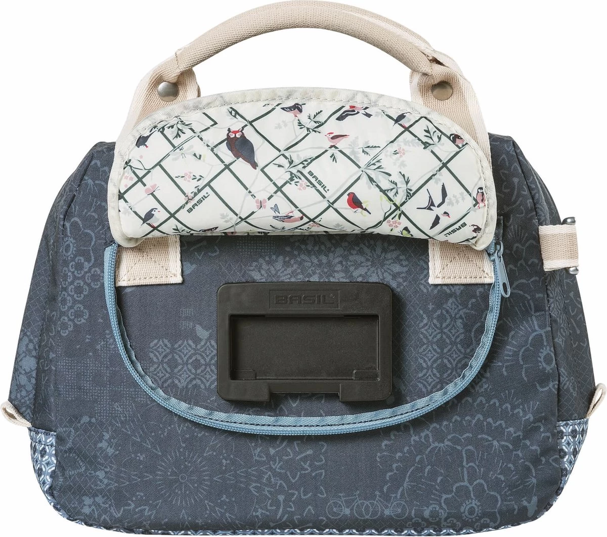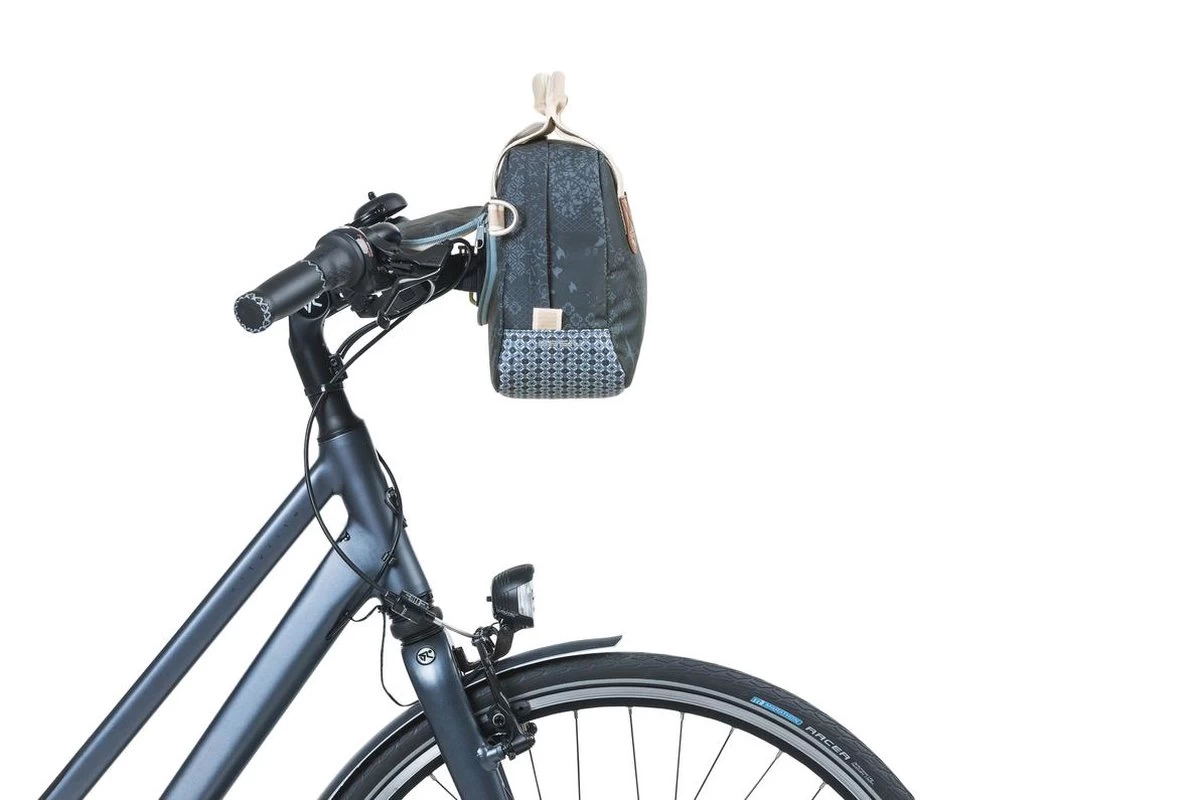 De Basil Bohè;me City bag is een elegante blauwe hand-, schouder- en stuurtas in è;è;n, met stijlvolle bohemien print. Een fietstochtje naar het terras in de stad of een middagje shoppen met die vriendin, je kan al snel niet meer zonder deze Bohè;me City Bag. De tas heeft een stevige binnenvoering, een ritsvak en een inhoud van 8 liter. Ruimte genoeg dus voor je dagelijkse benodigdheden zoals een flesje water, je portemonnee en lunch. Door het waterafstotende polyester blijven je spullen droog tijdens een kleine regenbui. De kunstlederen details en de vrolijke bohemienprint met grafische kruissteekpatroon en vogelsilhouetten, zorgen voor een trendy uitstraling. Door het afneembare schouderhengsel, is de tas ook als schoudertas te dragen. De tas is vast te maken dankzij de voorgemonteerde KF adapterplaat. In het donker ben je beter zichtbaar door de reflectiedetails. De Basil Bohè;me City Bag is ook verkrijgbaar in de kleuren rood en groen. Deze tas onderdeel van de Basil Bohè;me collectie. Zo heeft deze elegante Bohème lijn ook een dubbele tas, een grotere schoudertas en bijpassende fietsaccessoires. Eigenschappen: Je valt extra op in het donker door de reflectiedetails. De tas is van waterafstotend materiaal waardoor die ook tegen een kleine regenbui kan, maar zal na een hele dag in de regen niet meer kurkdroog zijn. Afneembaar schouderhengsel waardoor je de tas als schouder-, hand- of stuurtas kan gebruiken.