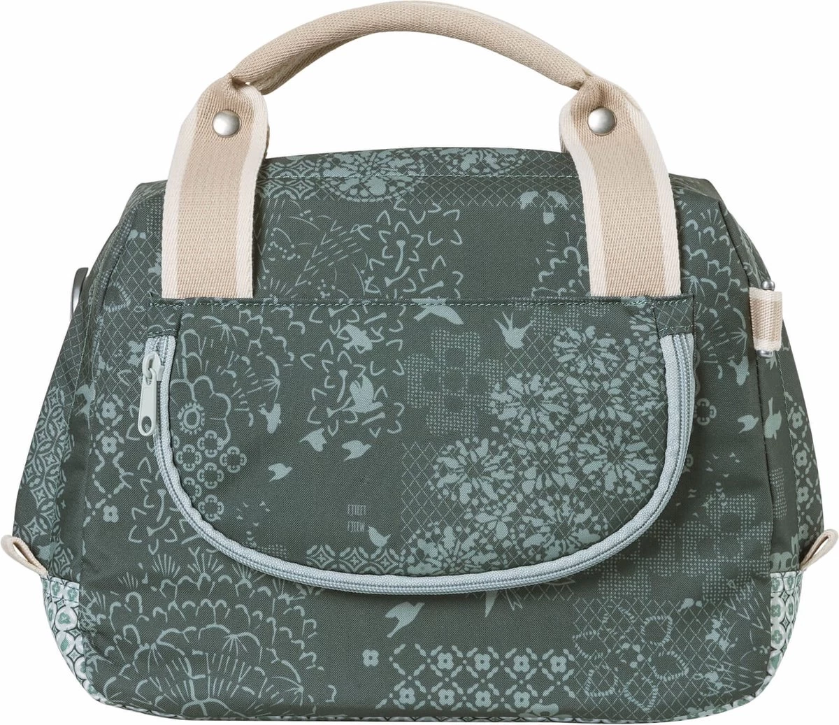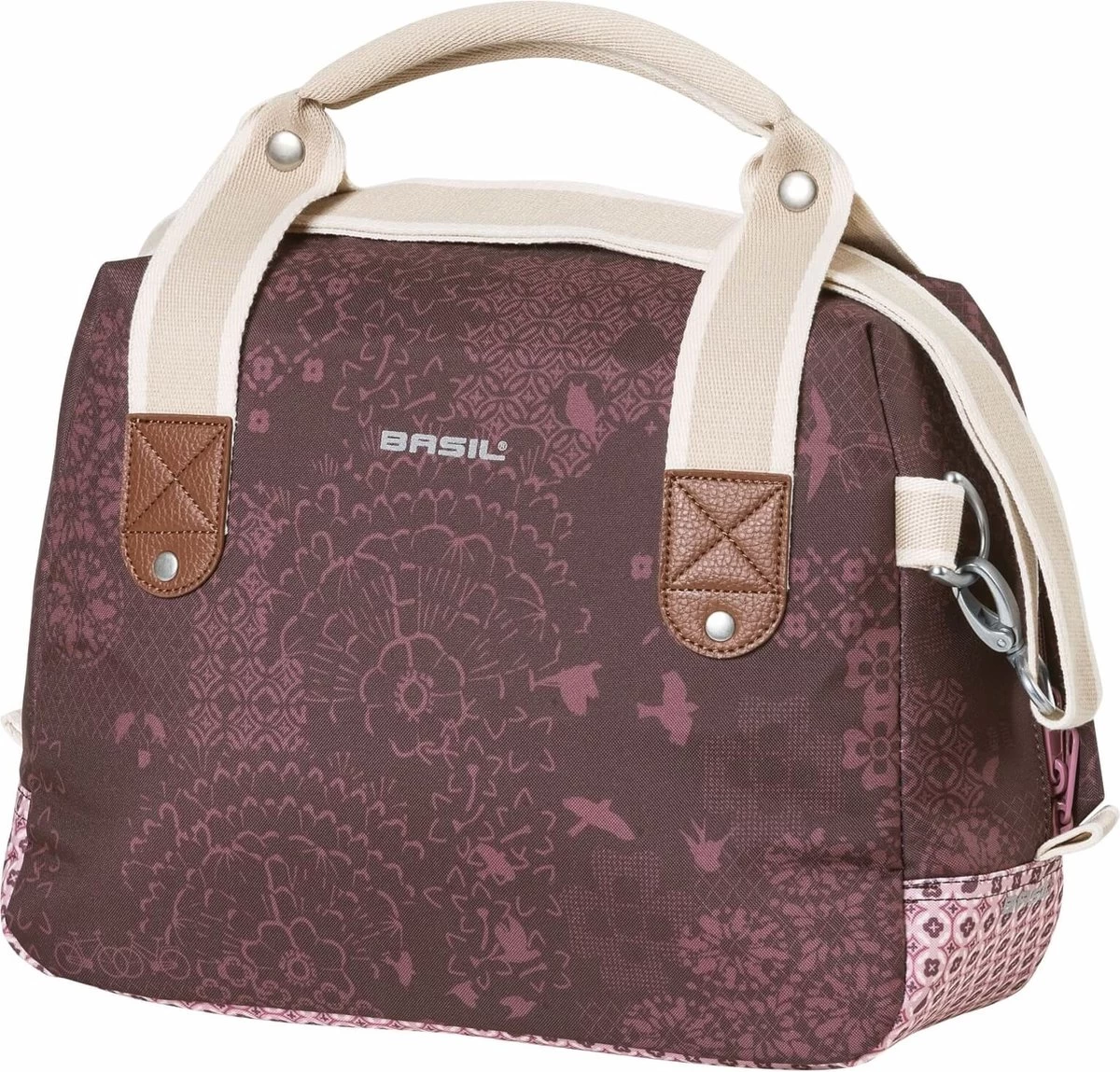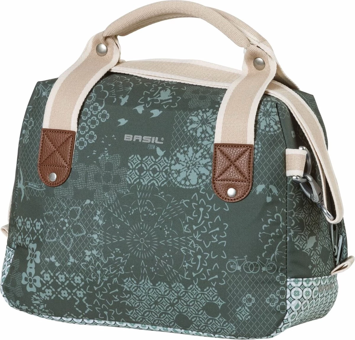De Basil Bohè;me City bag is een elegante blauwe hand-, schouder- en stuurtas in è;è;n, met stijlvolle bohemien print. Een fietstochtje naar het terras in de stad of een middagje shoppen met die vriendin, je kan al snel niet meer zonder deze Bohè;me City Bag. De tas heeft een stevige binnenvoering, een ritsvak en een inhoud van 8 liter. Ruimte genoeg dus voor je dagelijkse benodigdheden zoals een flesje water, je portemonnee en lunch. Door het waterafstotende polyester blijven je spullen droog tijdens een kleine regenbui. De kunstlederen details en de vrolijke bohemienprint met grafische kruissteekpatroon en vogelsilhouetten, zorgen voor een trendy uitstraling. Door het afneembare schouderhengsel, is de tas ook als schoudertas te dragen. De tas is vast te maken dankzij de voorgemonteerde KF adapterplaat. In het donker ben je beter zichtbaar door de reflectiedetails. De Basil Bohè;me City Bag is ook verkrijgbaar in de kleuren rood en groen. Deze tas onderdeel van de Basil Bohè;me collectie. Zo heeft deze elegante Bohème lijn ook een dubbele tas, een grotere schoudertas en bijpassende fietsaccessoires. Eigenschappen: Je valt extra op in het donker door de reflectiedetails. De tas is van waterafstotend materiaal waardoor die ook tegen een kleine regenbui kan, maar zal na een hele dag in de regen niet meer kurkdroog zijn. Afneembaar schouderhengsel waardoor je de tas als schouder-, hand- of stuurtas kan gebruiken.