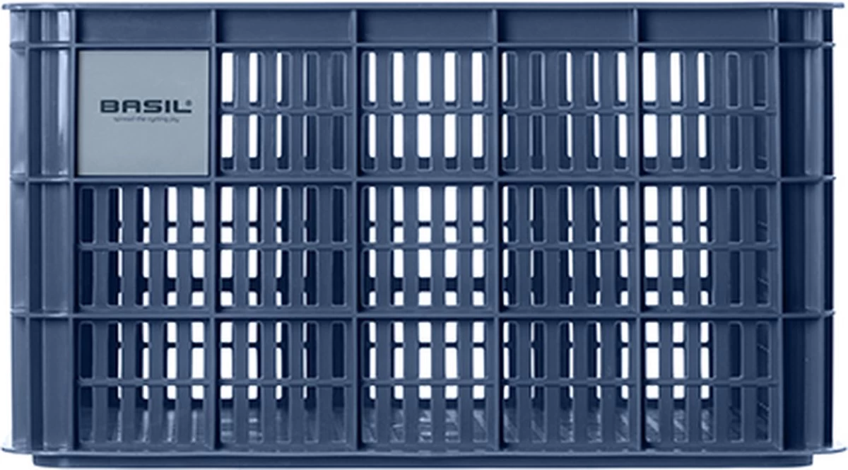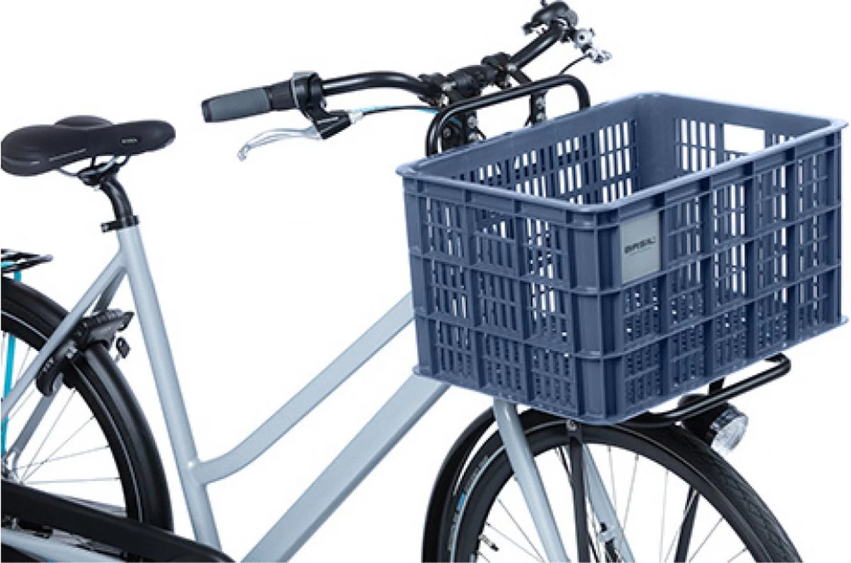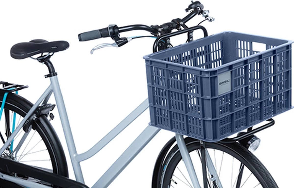 De Basil fietskrat in de maat L is een blauwe fietskrat voor op een dames- of herenfiets. De fietskrat is gemaakt van duurzaam materiaal en heeft een inhoud van 40 liter.
