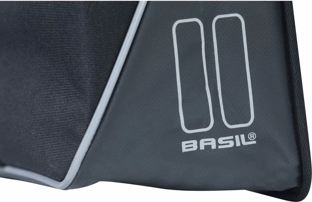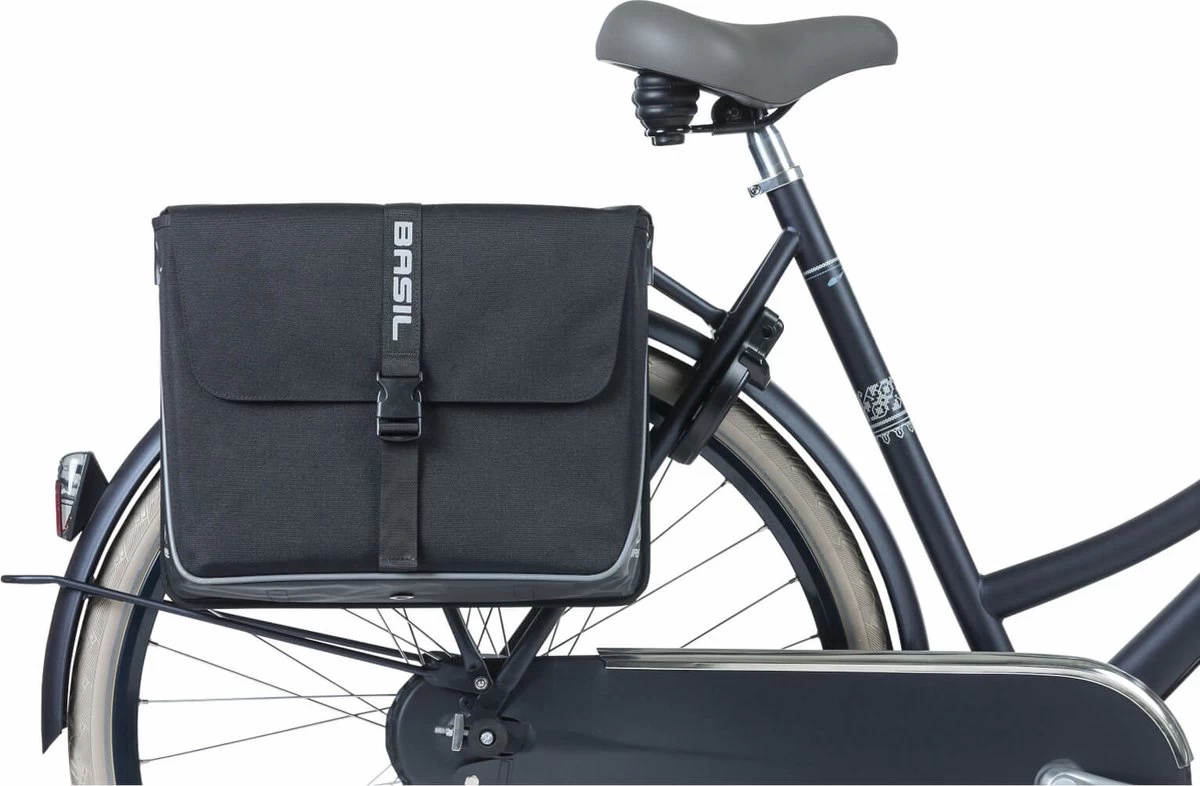 De Basil Forte Double bag is een echte krachtpatser! Dankzij de extra stevige constructie neem je veel boodschappen (én nog even dat laatste cadeautje voor vanavond) mee. Daarnaast is de tas gemaakt van waterafstotend polyester in combinatie met tarpaulin. De dubbele fietstas heeft een aansnoerband en verstelbare sluiting. De reflectie op alle zijden én een extra lange reflective piping zorgen ervoor dat je beter zichtbaar bent in het donker. Met het Universal Bridge systeem bevestig je de dubbele fietstas eenvoudig aan je bagagedrager. Ook aan de bagagedrager voor je elektrische fiets. Dankzij het Universal Bridge systeem kun je de tas op drie manieren bevestigen: Met de meegeleverde riempjes monteer je de tas vast op je bagagedrager. In combinatie met een adapterplaat, afneembaar. Geschikt voor adapterplaten van MIK, Racktime, i-Rack/Carrymore. Deze adapterplaten dien je apart aan te schaffen. In combinatie met het DBS- detachable bag systeem, ook afneembaar. De Forte Double bag is ook verkrijgbaar in een zwarte kleur. Nieuwsgierig? Kijk dan hier. Tip: combineer de Forte double bag in het zwart met de Basil afstandhouder (apart verkrijgbaar). Hiermee voorkom je dat de tas (vooral met zwarte boodschappen) in de spaken van je fiets komt. Heb je een kinderzitje op je fiets? Combineer dan de Forte Double bag met de Basil Carrier extender. Met deze handige extender ‘verleng’ je jouw bagagedrager en kun je de Forte double bevestigen. Eigenschappen: Ruime inhoud van maar liefst 35 liter voor al je spullen. Voorzien van een extra stevige constructie. Waterafstotend materiaal houdt de inhoud van jouw fietstassen droog. Beter zichtbaar door de reflectie.