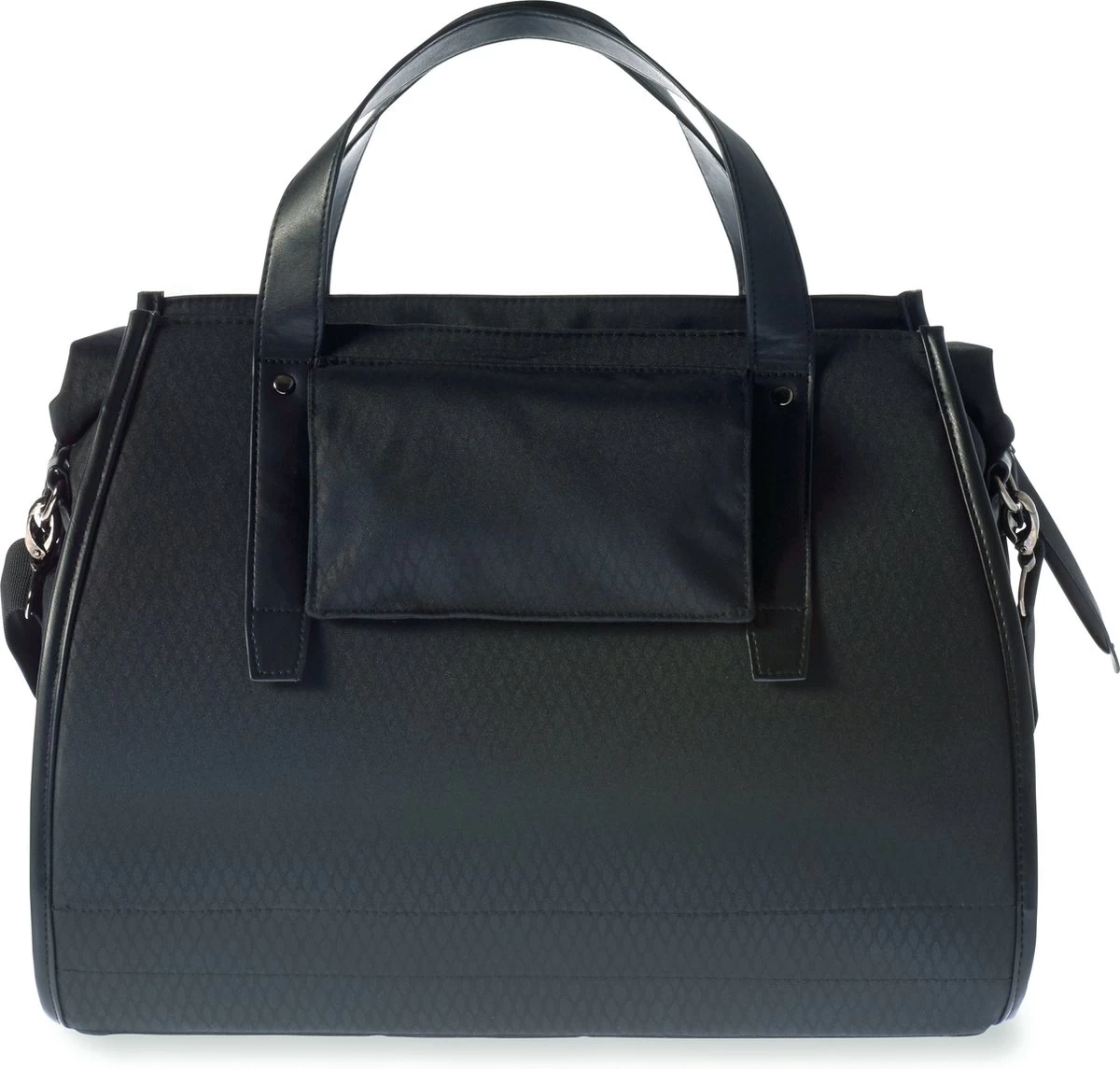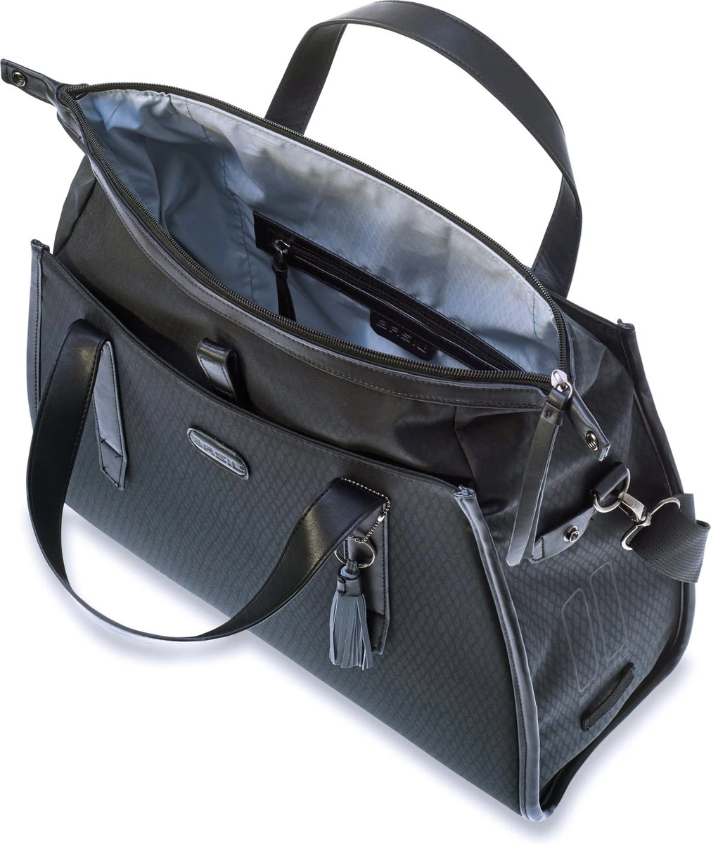 De Basil Noir Business bag is een elegante zwarte fiets,- schouder- en handtas in één. Of je nu onderweg bent naar kantoor of die lunchafspraak, deze tas maakt jouw fietsrit leuker en makkelijker. Door de cobra print en vegan lederen details ga jij stijlvol over straat, of je nu voor een elegante of business look gaat. Is er regen voorspeld? Deze Business bag is waterdicht, waardoor je spullen droog blijven. De inhoud van de tas is 17 liter en beschikt over een rolsluiting met rits en meerdere vakken. Zo is er een voorvak en ritsvak aan de binnenkant, zodat je jouw spullen lekker overzichtelijk kan opbergen. Dankzij de handhengsels en afneembare schouderhengsels, kun je de tas als schouder- maar ook als handtas gebruiken. Het Hook-On System zorgt ervoor dat de tas eenvoudig aan je bagagedrager te haken is. Dit systeem is op een nette manier weggewerkt met behulp van een afsluitbare flap. Heb je een avondje doorgewerkt en moet je in het donker naar huis? Dan zorgen de reflectiedetails en reflecterende kwastje ervoor, dat je beter zichtbaar bent. Ook is er een bevestigingsmogelijkheid voor ledverlichting. De Basil Noir Business bag is onderdeel van de Basil Noir collectie. Ben jij op zoek naar een grotere variant of bijpassende fietsaccessoires? Neem dan eens een kijkje bij de rest van deze Basil Noir Collectie. Eigenschappen: Waterdichte tas, waardoor jouw spullen lekker droog blijven. Afneembare schouderband, waardoor je een fiets-, schouder- en handtas in één hebt. Diverse vakken, aan de voorkant en binnenkant van de tas. Hook-On System waardoor de tas makkelijk aan de bagagedrager te haken is. Je bent extra zichtbaar door de reflectiedetails en reflecterende kwastje.