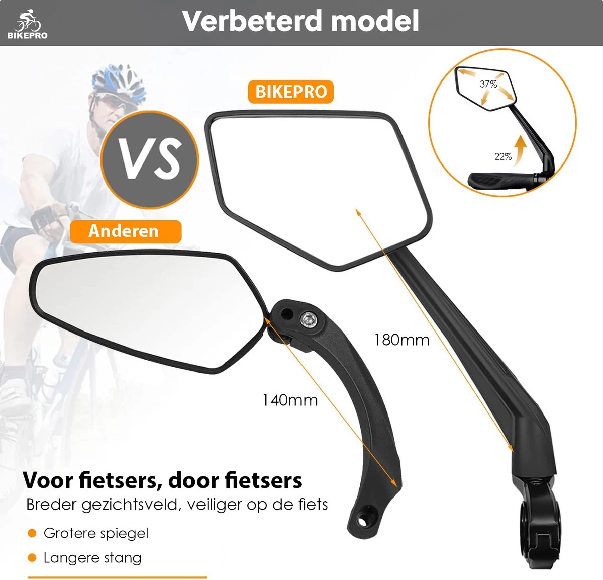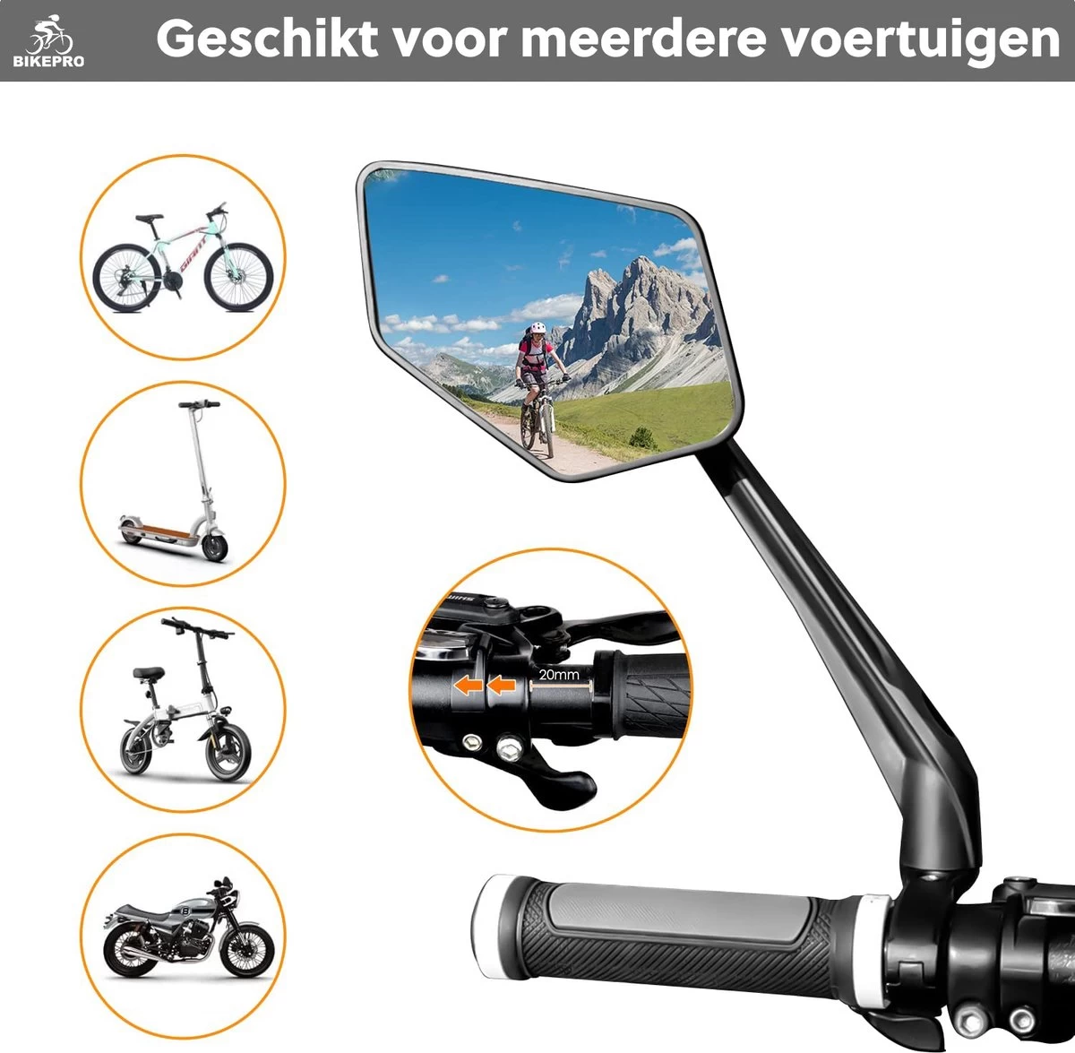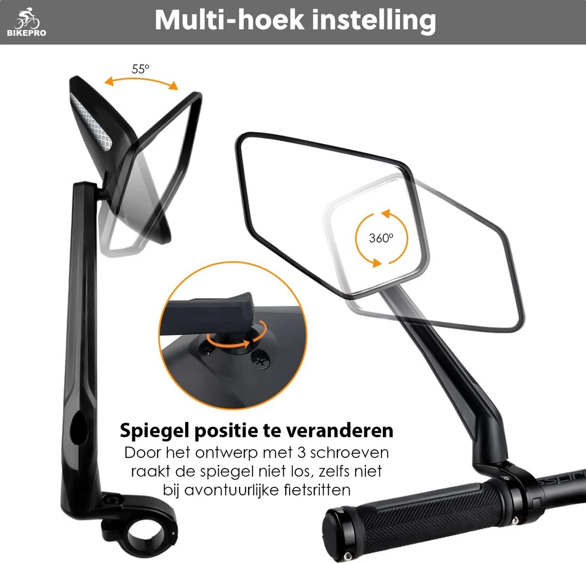 Voorkom gevaarlijke verkeerssituaties met de fietsspiegels van BikePro. De zwarte spiegels zijn voorzien van een 360 graden verstelbaarheid, zodat de spiegel voor iedereen in de juiste stand kan worden gezet. Het stevige materiaal zorgt dat de spiegel niet trilt, zodat u ten alle tijden uw omgeving in de gaten kan houden door het zachte HD glas. Mist u toch iets? Zorgen de reflectoren dat uw tegenligger tijdig wordt gealarmeerd.