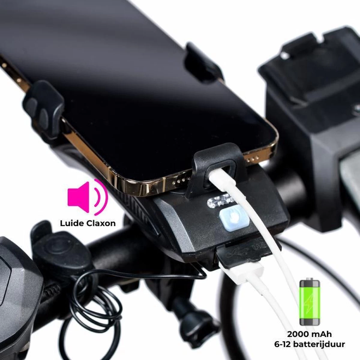 Maak je nooit meer zorgen over een lege batterij tijdens het fietsen. Met de ingebouwde powerbank ben je altijd verzekert van een opgeladen telefoon om bijvoorbeeld mee te navigeren. De oplaadbare powerbank is na ongeveer 5 uur volledig opgeladen. Laad deze op met behulp van het bijgeleverde USB kabeltje. De telefoonhouder is voorzien van een 400 lumen krachtig fietslicht en is in 3 standen in te stellen: fel, zwak en knipperstand. Het krachtige licht gaat 6-12 uur mee. Ten slotte is de telefoonhouder voorzien van een luide claxon. Dit biedt de extra veiligheid die je tijdens het fietsen nodig hebt. Laat je omgeving weten dat jij eraan komt!