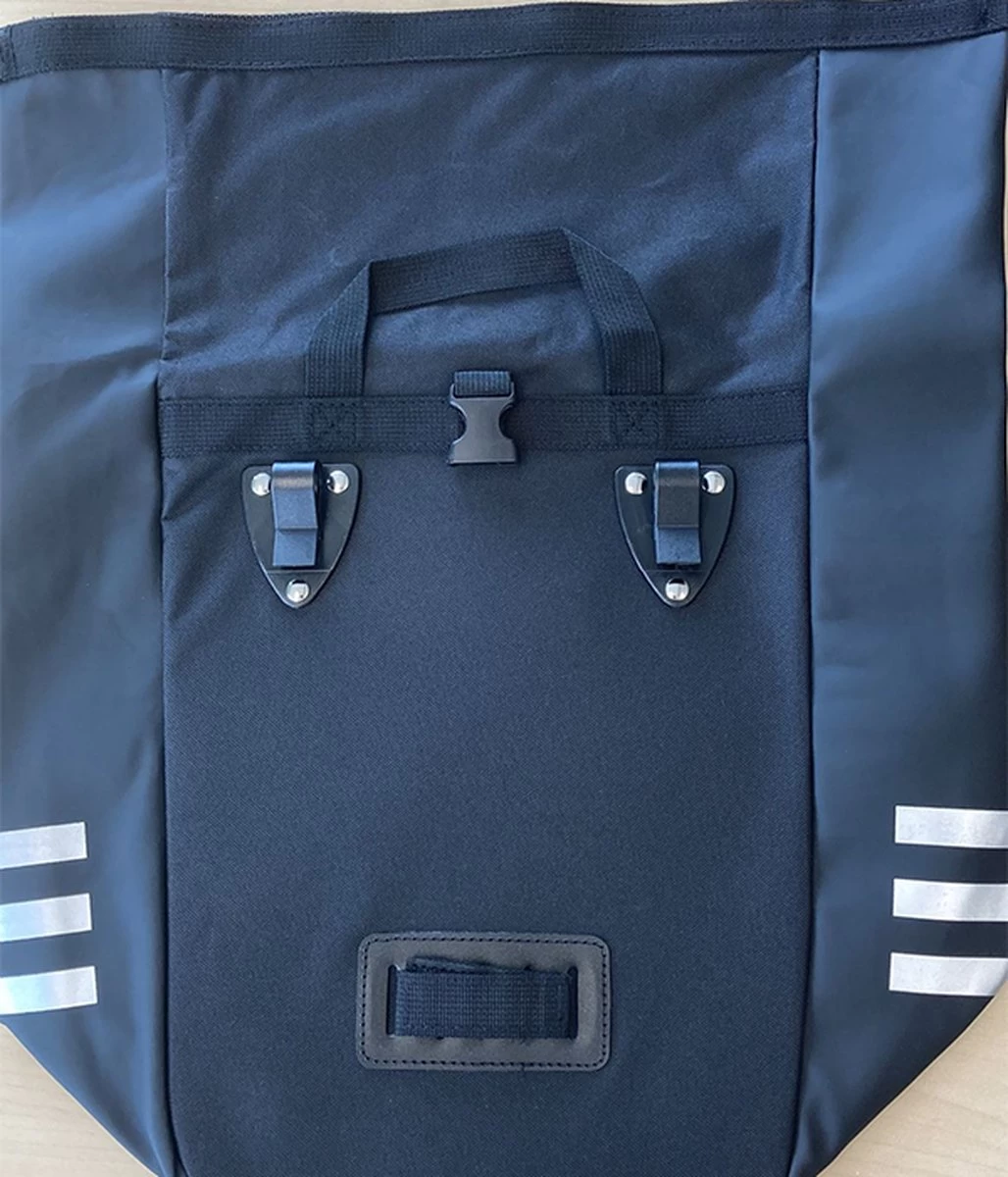 Fietstas/shopper combi met rolsluiting. Achterzijde met fietsklemmen. Voorzien van reflecterende bandjes voor de veiligheid. Met voorvak en een verstelbare en afneembare schouderband. Voorzien van een voorvak met rits en een schouderband. Erg cool en leuke uitstraling in combi met praktisch en veilgheid verhogend. Van 600D/PVC materiaal.