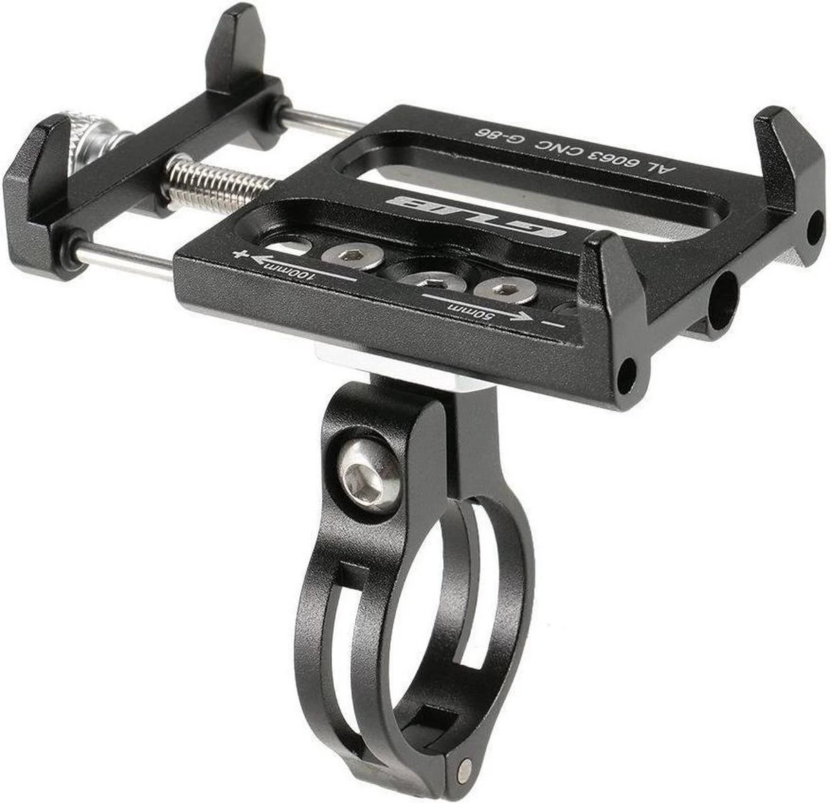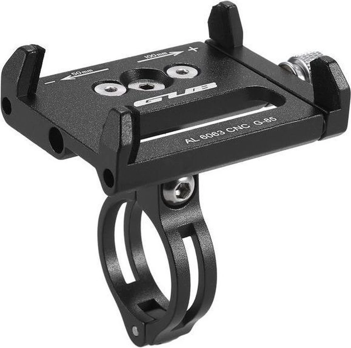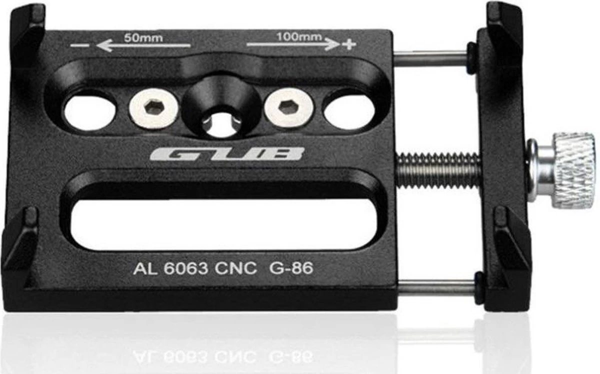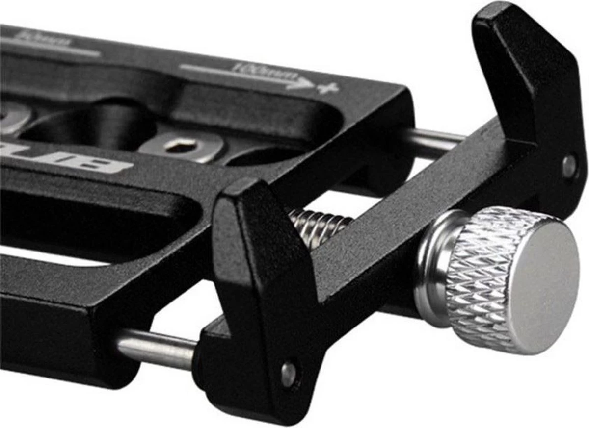 De aluminium houder heeft vier klemmen waarmee de telefoon wordt vastgezet. Draai de grijze draaiknop aan de zijkant aan zodat uw telefoon goed strak zit. Kussentjes om schade aan uw telefoon te voorkomen worden bijgeleverd. Deze fietshouder is universeel, waardoor vrijwel alle smartphones met de houder te gebruiken zijn. Elke smartphone tussen de 5,5 en 10 centimeter breed past in de houder, ook als deze in een hoesje zit. Omdat de aluminium klemmen dik en zeer sterk zijn is deze houder ideaal geschikt voor het gebruik op een mountainbike.
