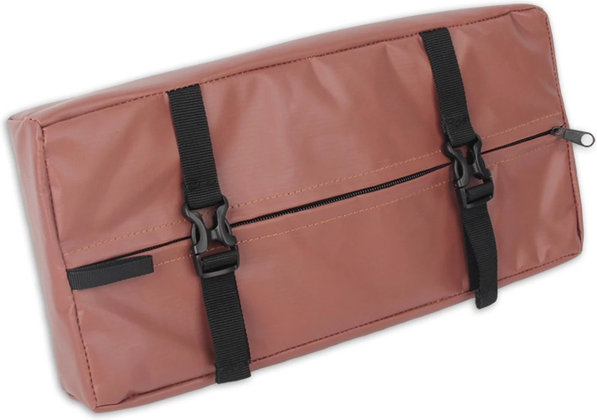 Het bagagedrager kussen is waterbestendig en meet 34x16x5cm.