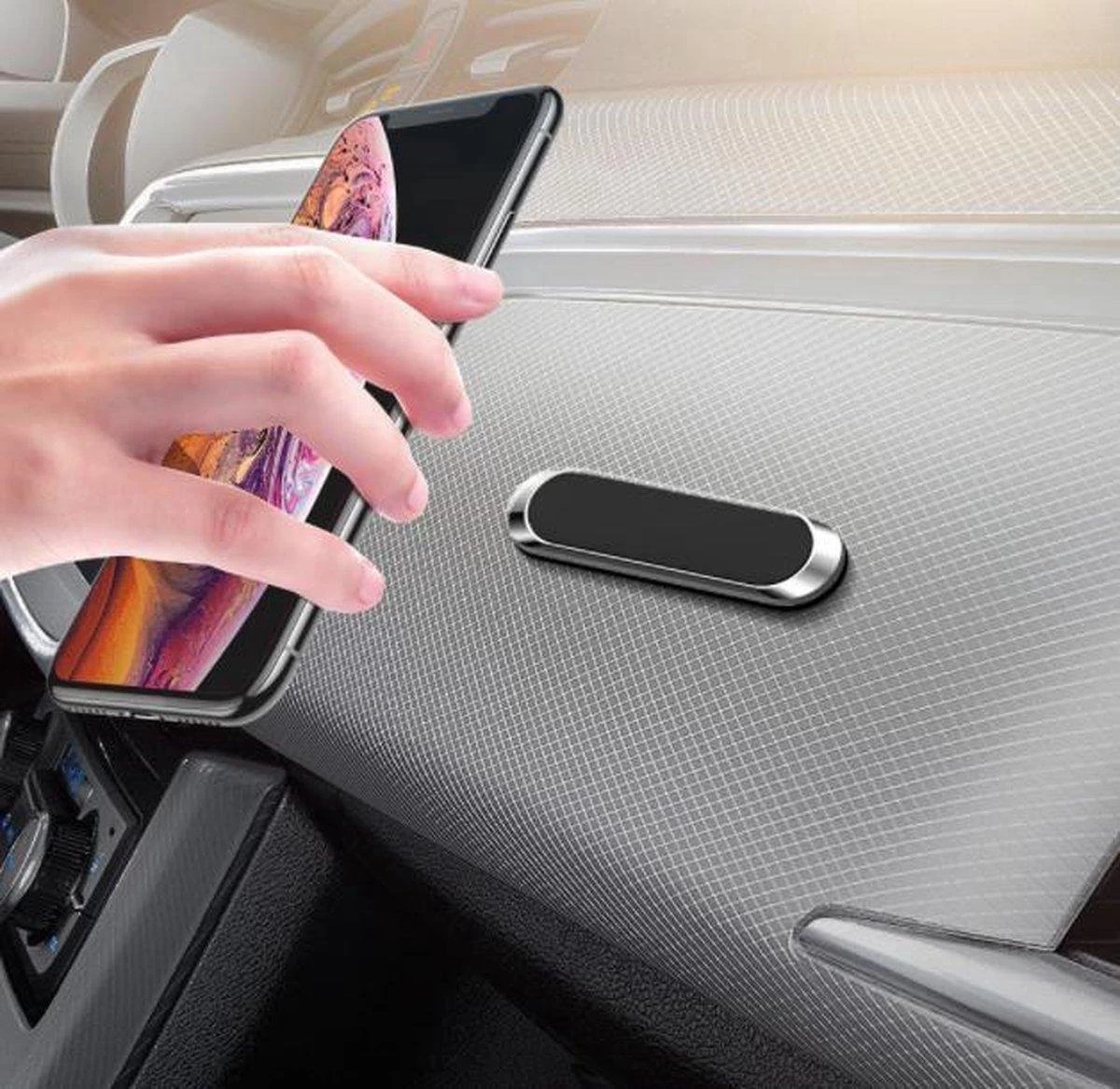 Aan de achterkant van je smartphone of smartphonehoes plak je de magneetplaatje (meegeleverd d.m.v. dubbelzijdige tape), je plaatst de telefoonhouder in de door jou gewenste ventilatierooster en je bent klaar!