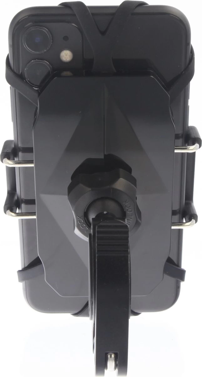 Deze telefoonhouder klemt de telefoon aan de zijkant en met elastiek in de hoeken waardoor deze houder extra veilig in gebruik is.