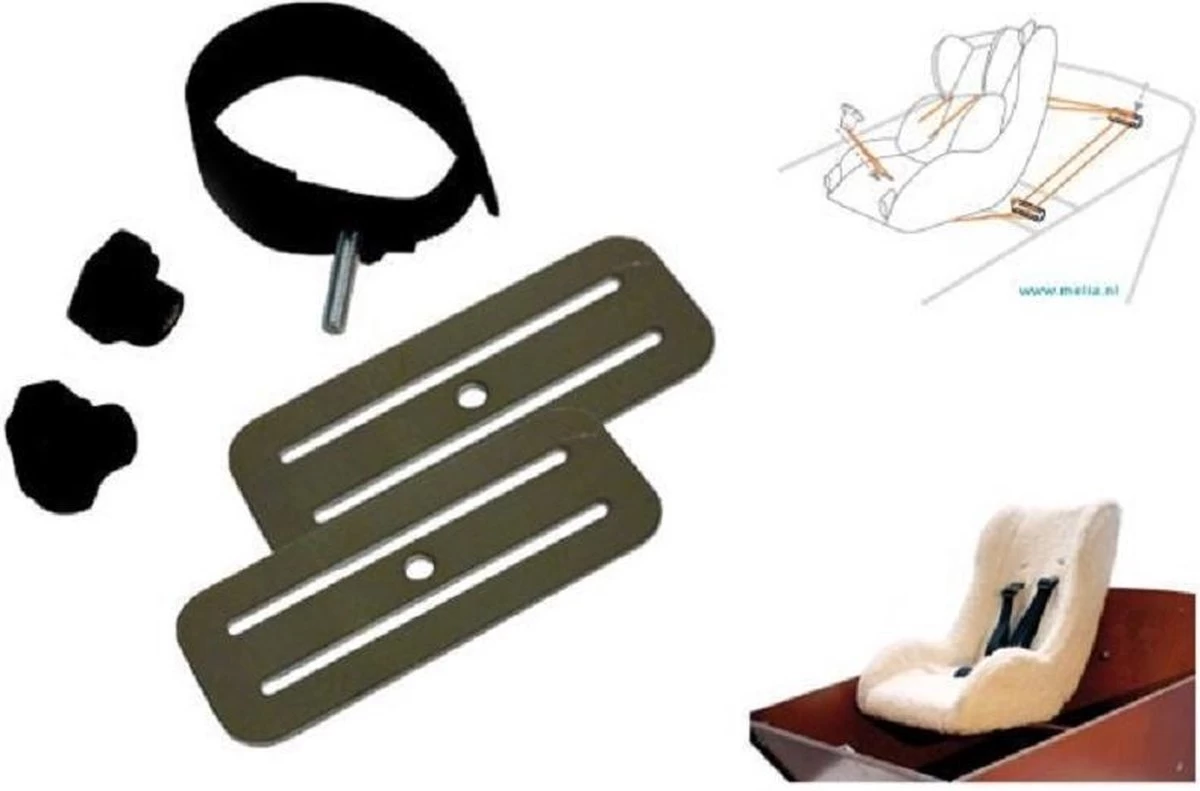 Bevestigingsset geschikt voor alle bakfietsen met een bak. Deze montage set maakt het mogelijk uw babyschaal en peuterstoel met 3-puntsgordel vast te zetten in een bakfiets en op ieder gewenst moment weer snel te verwijderen. Model “gat” is geschikt voor alle bakken met een gat ø 6mm (reeds aanwezig of door u geboord) in rug en zitvlak.