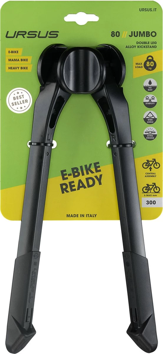 De Ursus Jumbo is een volledig aluminium dubbele standaard. Deze standaard combineert de stabiliteit met mechanische innovatie. De gepatenteerde mechanica zorgt ervoor dat de afstand tussen de twee poten verbreedt tot 40cm waardoor de fiets altijd stabiel gestald kan worden. Productspecificaties: 40cm brede poten wanneer uitgeklapt 20cm brede poten wanneer ingeklapt 300 millimeter lang Belastbaar tot 80 kilogram Gemaakt van sterk aluminium