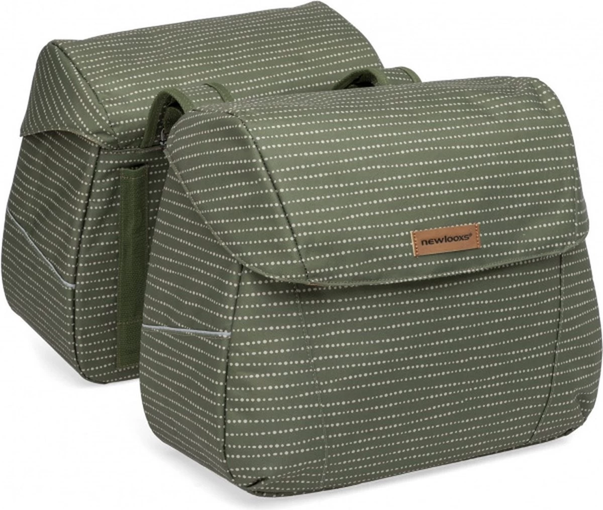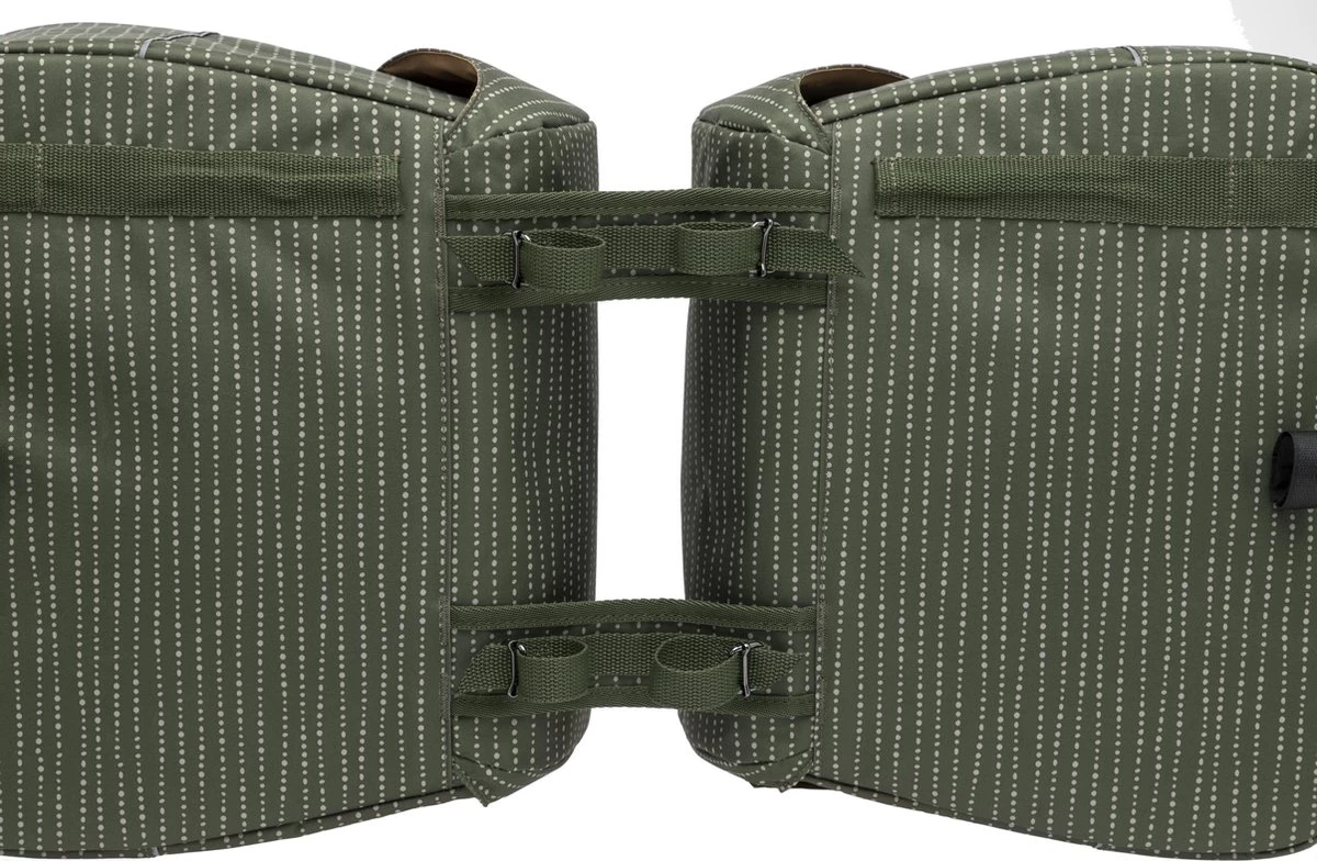 De Joli Double is gemaakt van waterdicht polyester. Doordat de klep over de tas heen valt is de tas goed waterafstotend voor gemiddelde regenbuien. Wil je ook de allerzwaarste regenbuien doorstaan? Dan raden wij aan om een New Looxs regenhoes voor dubbele fietstassen erbij te kopen. Daarmee maak je iedere tas 100 % waterdicht.