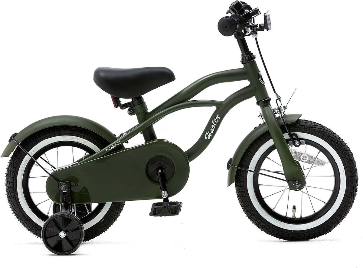 De Nogan Harley wordt standaard geleverd inclusief zijwieltjes, om je kindje op weg te helpen tijdens de eerste kilometers op de fiets. De zijwieltjes zijn gemakkelijk afneembaar, dus zodra je zoontje een ervaren coureur is, kan hij met deze Nogan Harley zonder zijwieltjes de weg op. Uiteraard hebben we veel aandacht besteed aan de veiligheid van deze kinderfiets. Zo is de Nogan Harley voorzien van veilige gesloten kettingkast, reflectoren (in de wielen, de trappers, aan de achter- en voorzijde van de fiets) en een fietsbel. Stevige metalen spatborden zorgen ervoor dat je zoontje niet vies wordt tijdens al zijn crossavonturen. Om tijdig tot stilstand te komen is deze jongensfiets uitgerust met een terugtraprem en een V-brake voorrem. Bijkomend voordeel hiervan is dat je zoontje direct op beide manieren leert remmen!
