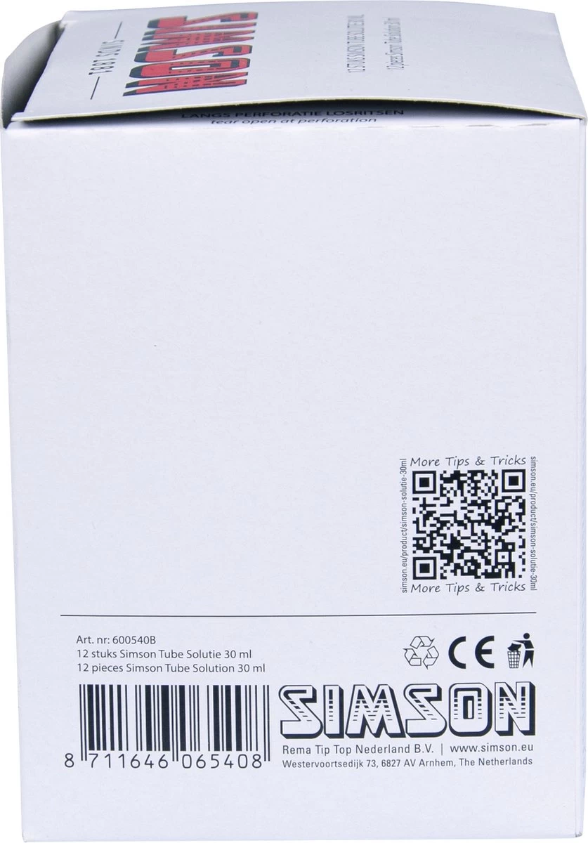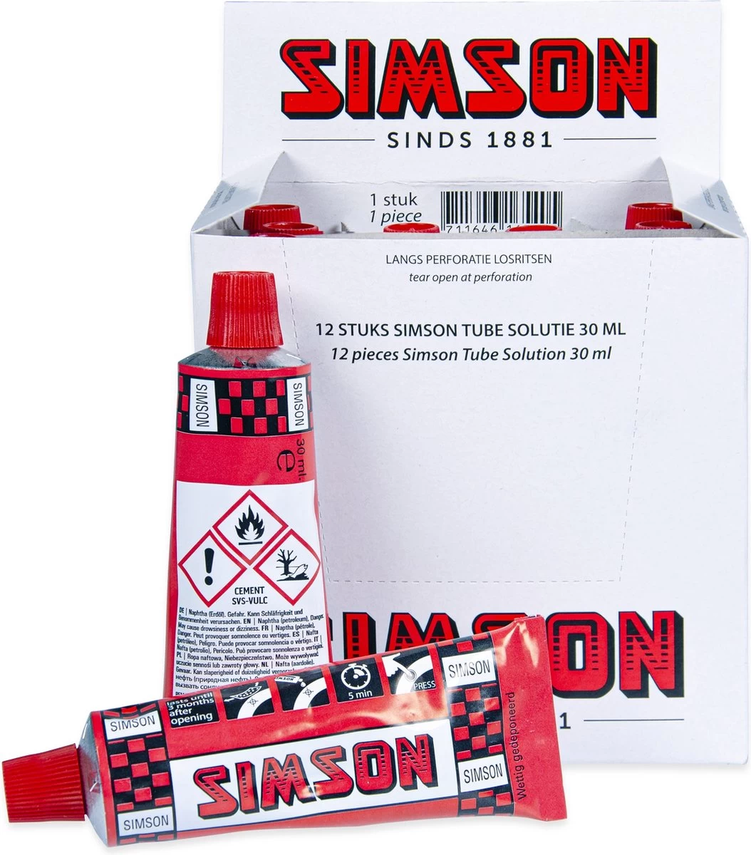 De Simson solutie is onmisbaar voor iedere fietser. Deze Simson bandenlijm zit in een knijptube van 30ML en is geschikt voor het koud vulkaniseren van pleisters. De Simson solutie is door zijn unieke formule sneldrogend. Na ongeveer 90 seconden kun je beginnen met het plakken van je band, zodat je snel weer op weg kunt.