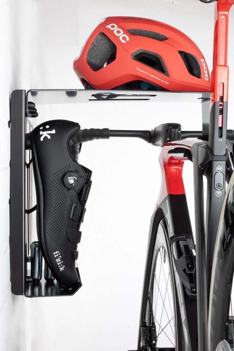 De Stasdock is een krachtige en stijlvolle fiets muurbeugel voor jouw racefiets of mountainbike en is zo uitgerust dat je er ook fietsaccessoires in kunt opslaan, zoals je schoenen, helm, bril en luchtcapsules.