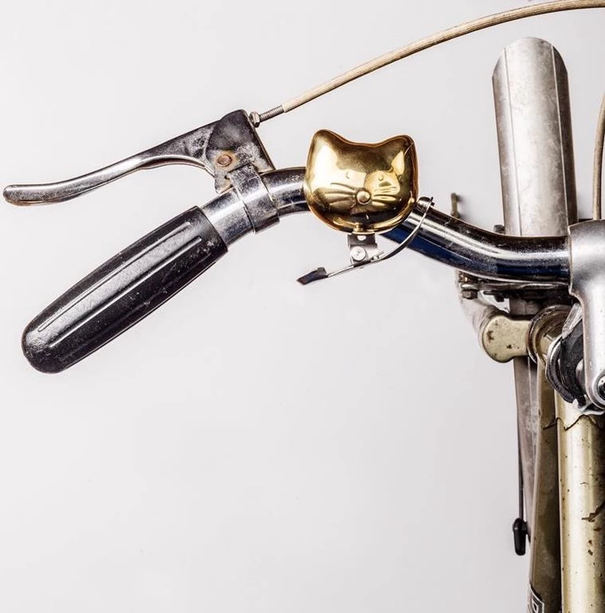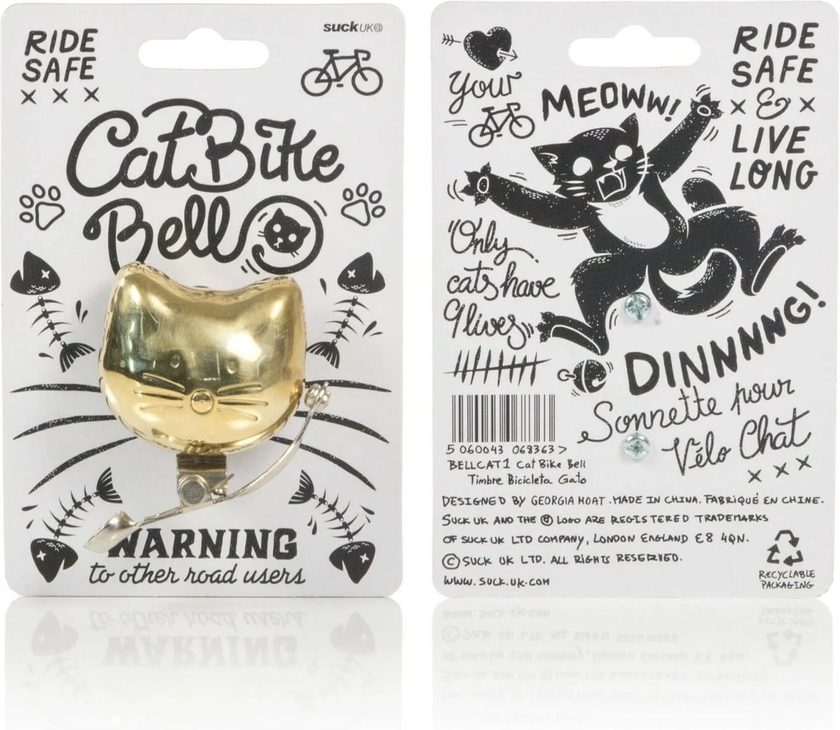 Kat fietsbel van Suck UK. Fietsbel van messing in de vorm van een kop van een kat. Poezenkop fietsbel in gouden kleur. De kat fietsbel maakt gebruik van een messing buitenkant en een springveer die er tegenaan springt. Maakt voldoende geluid om andere fietsers en mensen met honden aan de kant te jagen. Mooie kat fietsbel voor poezenliefhebbers. Afmeting: 5,2 x 4,6 x 4 centimeter.