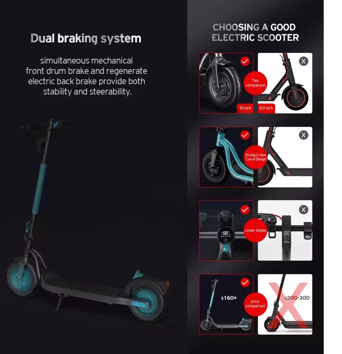De 10-inch luchtbanden, met superieure schokabsorptie, maken uw rit soepeler en stabieler, zelfs op hobbelig terrein of ruwe oppervlakken. Met de 350W krachtige motor levert de M5 een snelle en stevige rijervaring.