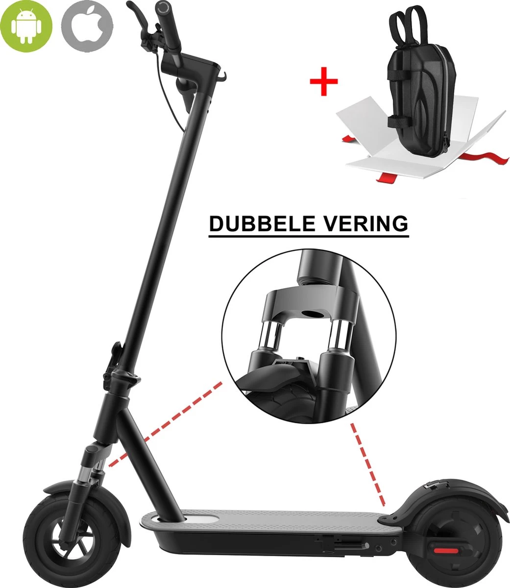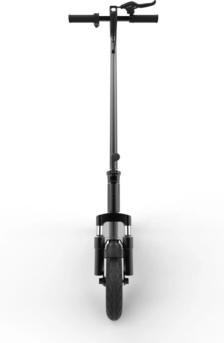 Wat hem extra bijzonder maakt is dat hij de 2 achterschokdempers (vering) heeft. De grote veringen aan de achter/voorzijde zorgen voor een grote schokabsorptie waardoor zelfs onverharde wegen makkelijk te berijden zijn. Een nieuw vouwsysteem, dus geen vibratie van de stuurkolom zoals bij de e-steps van andere merken!
