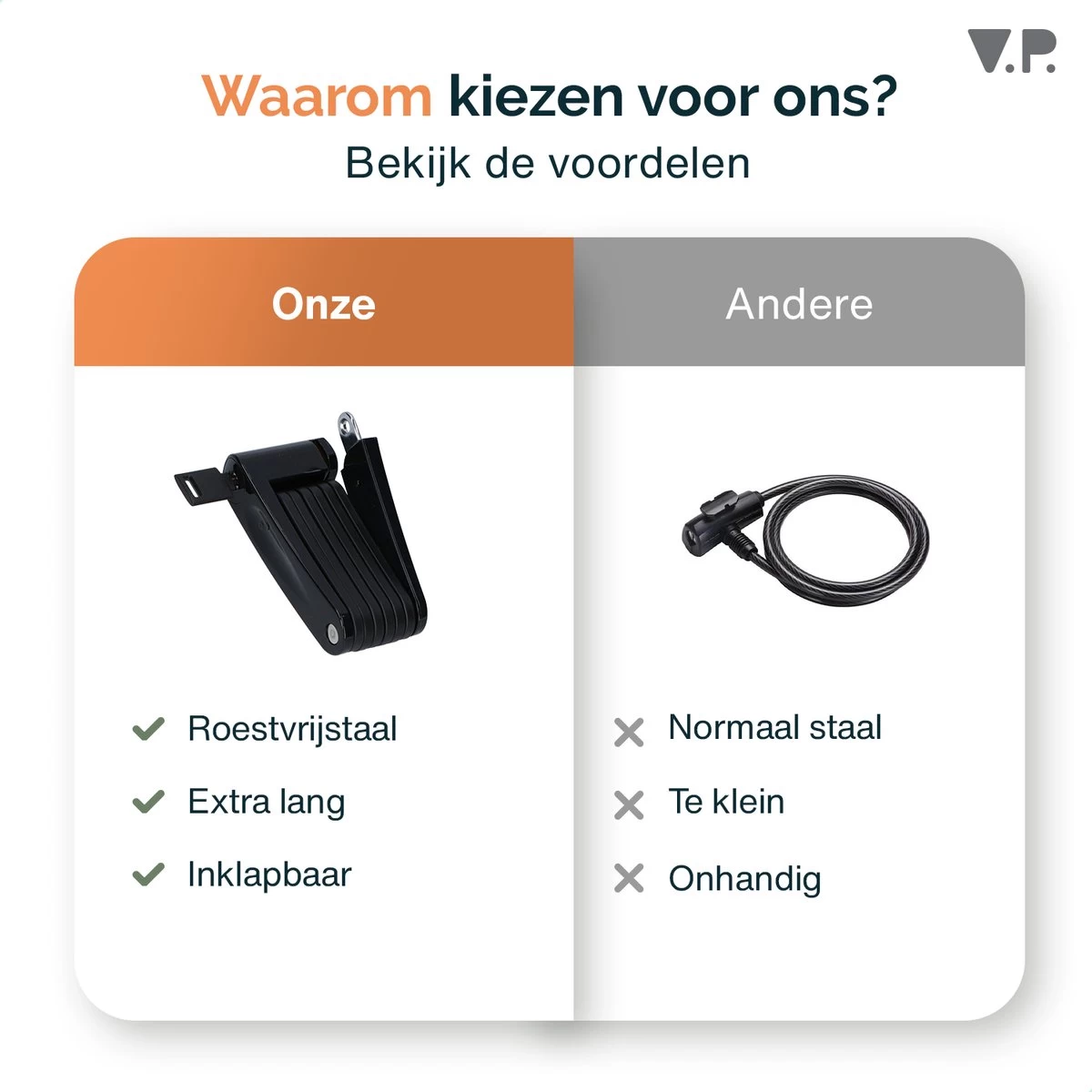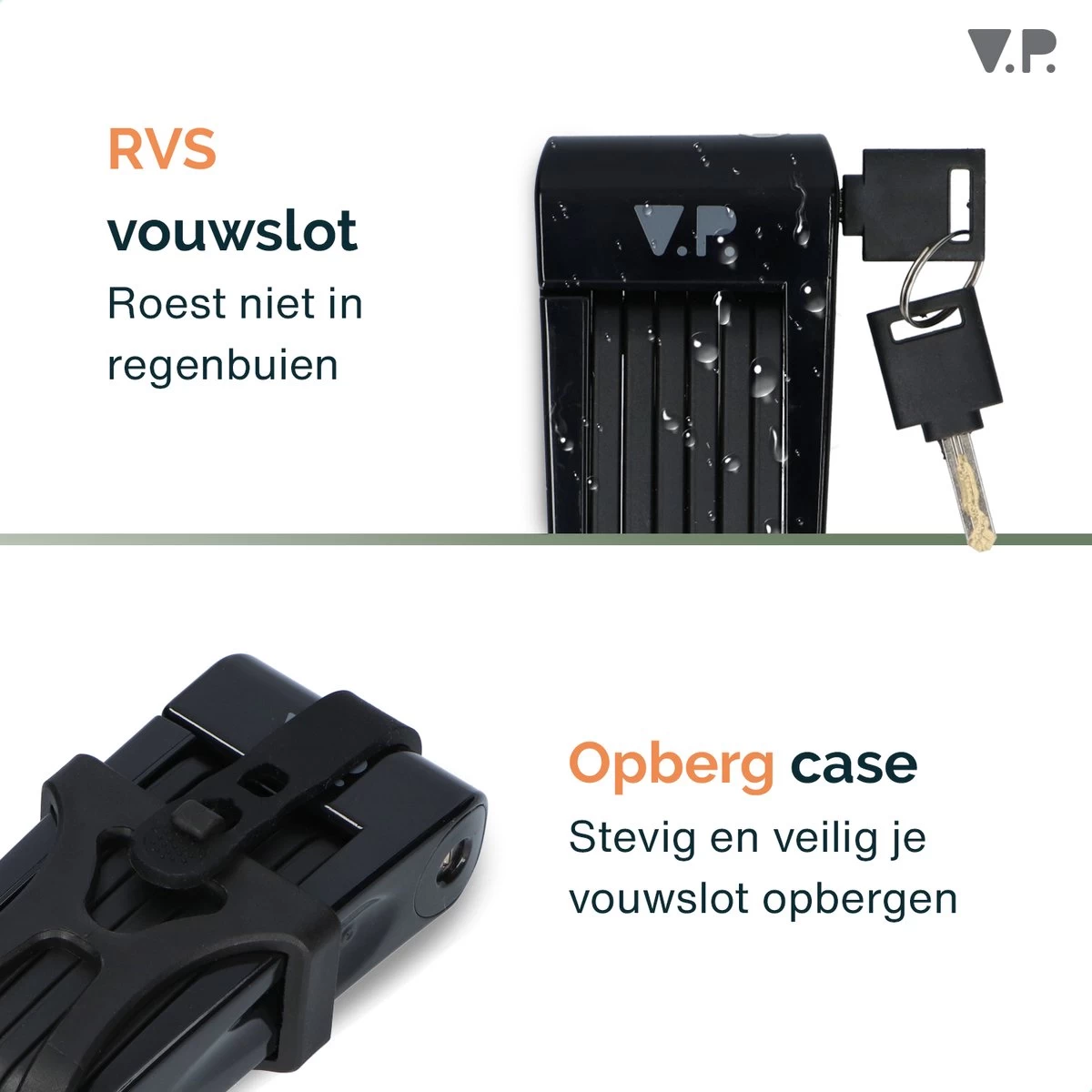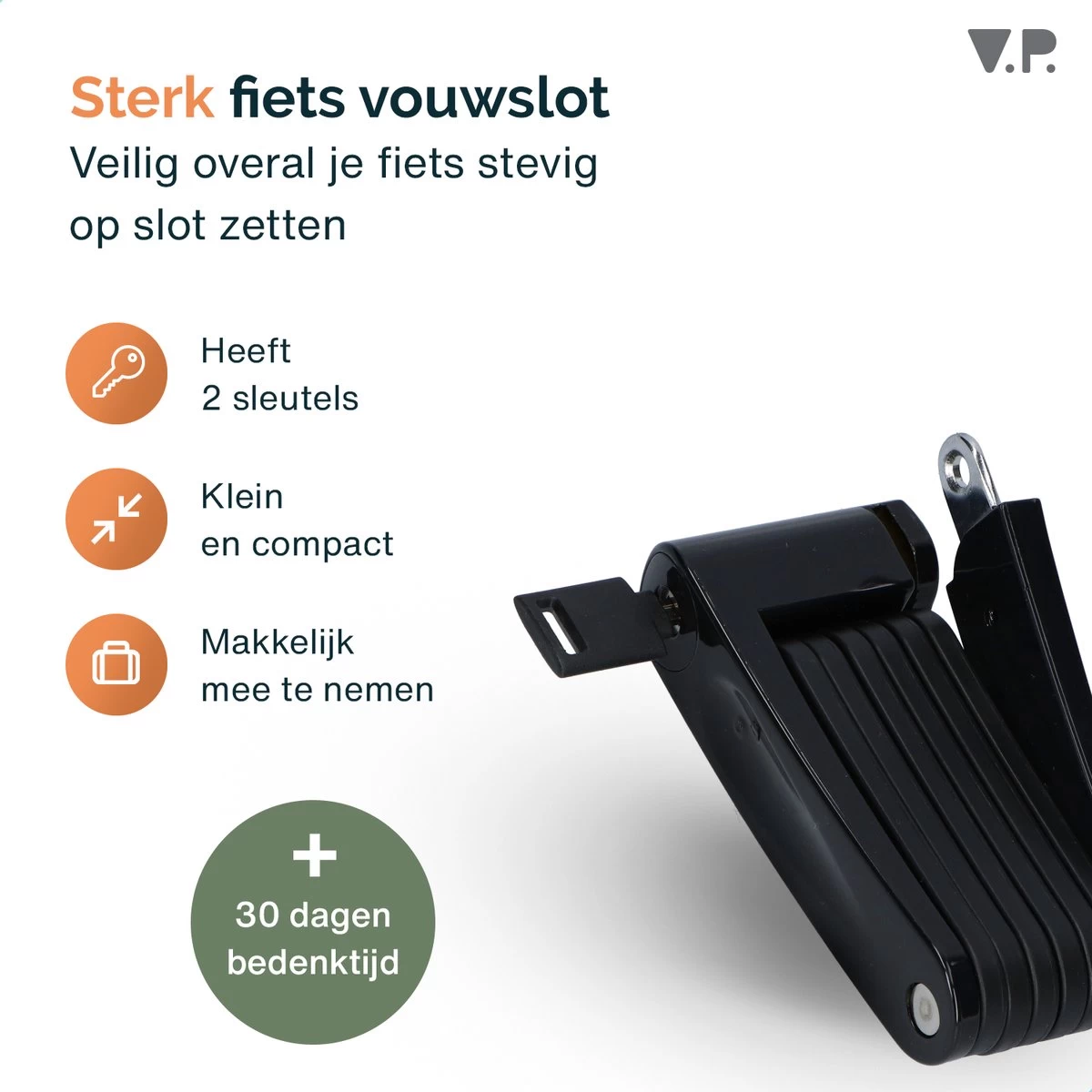 Het V.P. Vouwslot is een veilig fietsslot, gemaakt van stevige schakels die je eenvoudig kan inklapt of