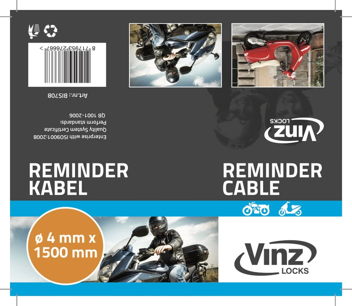 Verbind de VINZ reminderkabel tussen het slot en het stuur, zodat je nooit vergeet dat het slot er nog om zit!