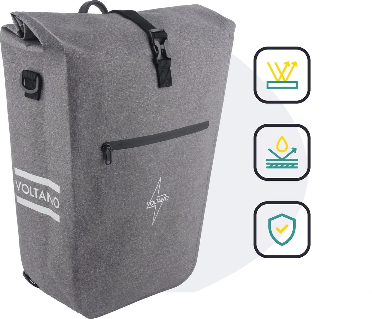 Over de Voltano Luxe E-bike Fietstas 28L โ Grijs โ Pakaftas Met Laptop vak โ 100% Waterdicht – Met Gratis Schouderband