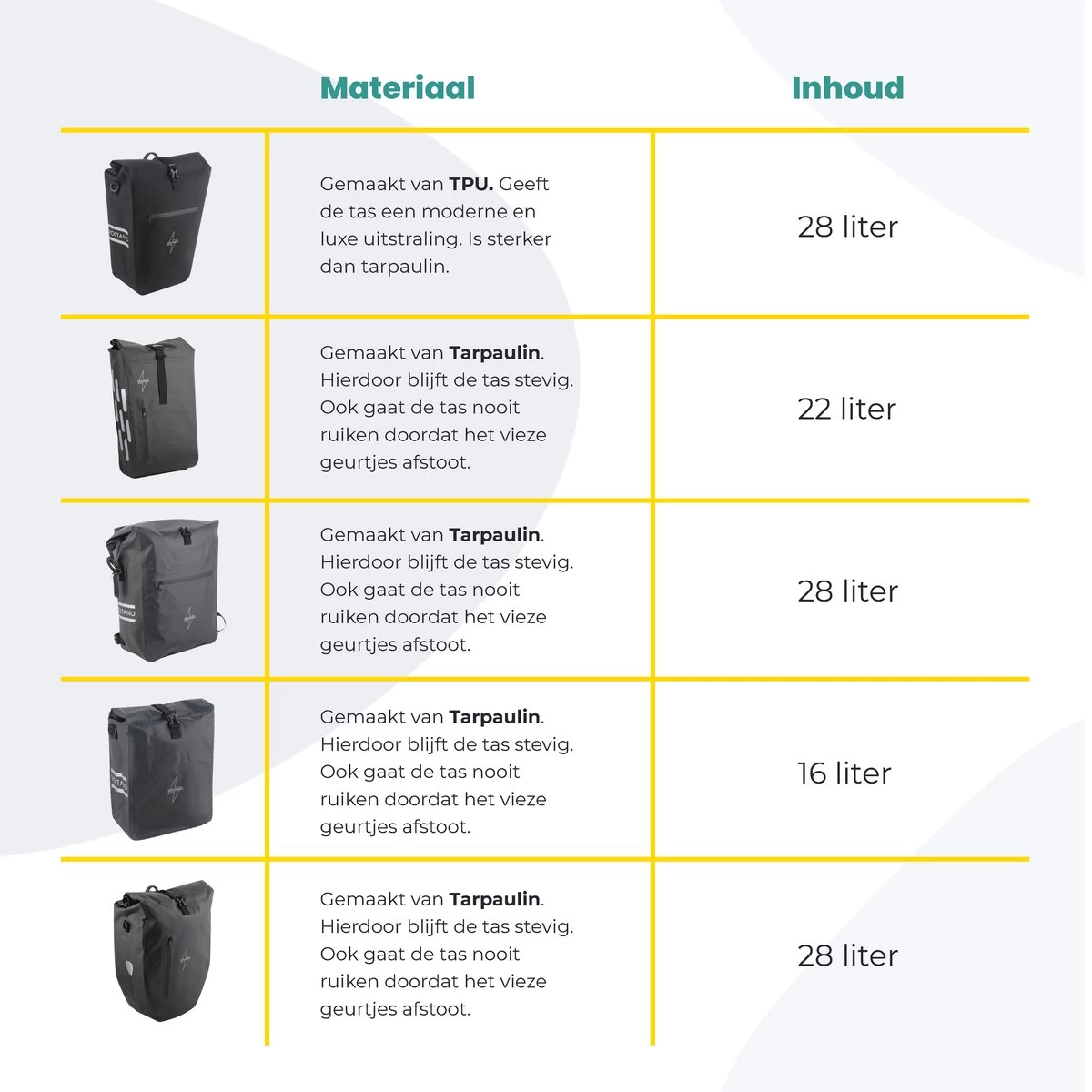 Of je nou een normale fiets, elektrische fiets, of een sport of race fiets hebt, deze fietstas past op nagenoeg elke bagagedrager. Als de bagagedrager een buisdiameter van 0.7 tot 1.5 cm heeft, kan de tas altijd worden bevestigd. Dit is nagenoeg altijd (in 99% van de gevallen) het geval. Heeft uw fiets een bagagedrager? Dan past de fietstas dus nagenoeg altijd! De tas wordt geleverd met twee extra stelringen. Hierdoor kan de pakaftas passend worden gemaakt voor elektrische fietsen met een accu bij de bagagedrager. Geen zorgen, dit is niet lastig en het spreekt voor zich hoe dit werkt.