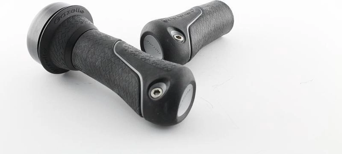 Gazelle handvatten met draaibel br /br /Comfortabele leren handvatten, waarvan het linker handvat is voorzien van een geintegreerde fietsbel. br /br /Specificaties: br /Lengte grepen: 105 mmbr /Totale lengte linker handvat: 150 mmbr /Kleur: zwartbr /Materiaal: rubberbr /Klemdiameter: 22,2 mmbr /Met een inbussleutel zijn de handvatten te monteren.